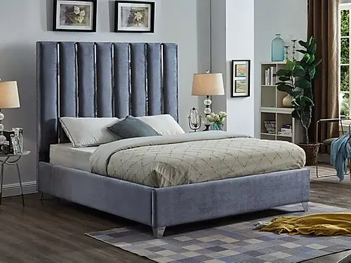 The Chrome Channel Design Features Velvet Grey Fabric Upholstery for a Sleek, Glamorous Look